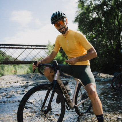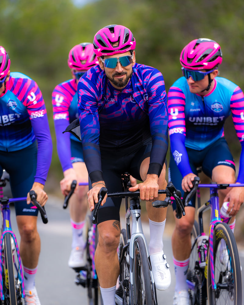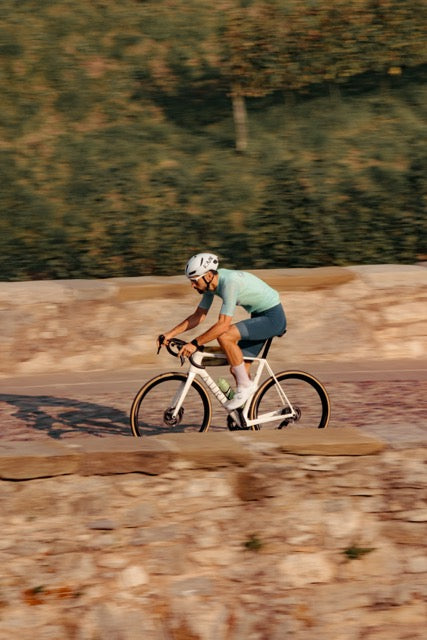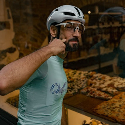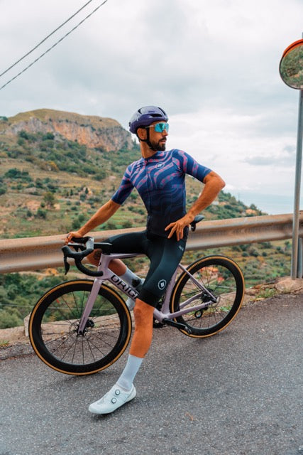 De sa tenue violette au design géométrique à son maillot "Cappuccino" pensé pour le gravel aux tons safaris, nous l'accompagnons dans ses aventures, de la Sicile aux différentes courses que notre cher Florian réalise seul ou avec des invités prestigieux !